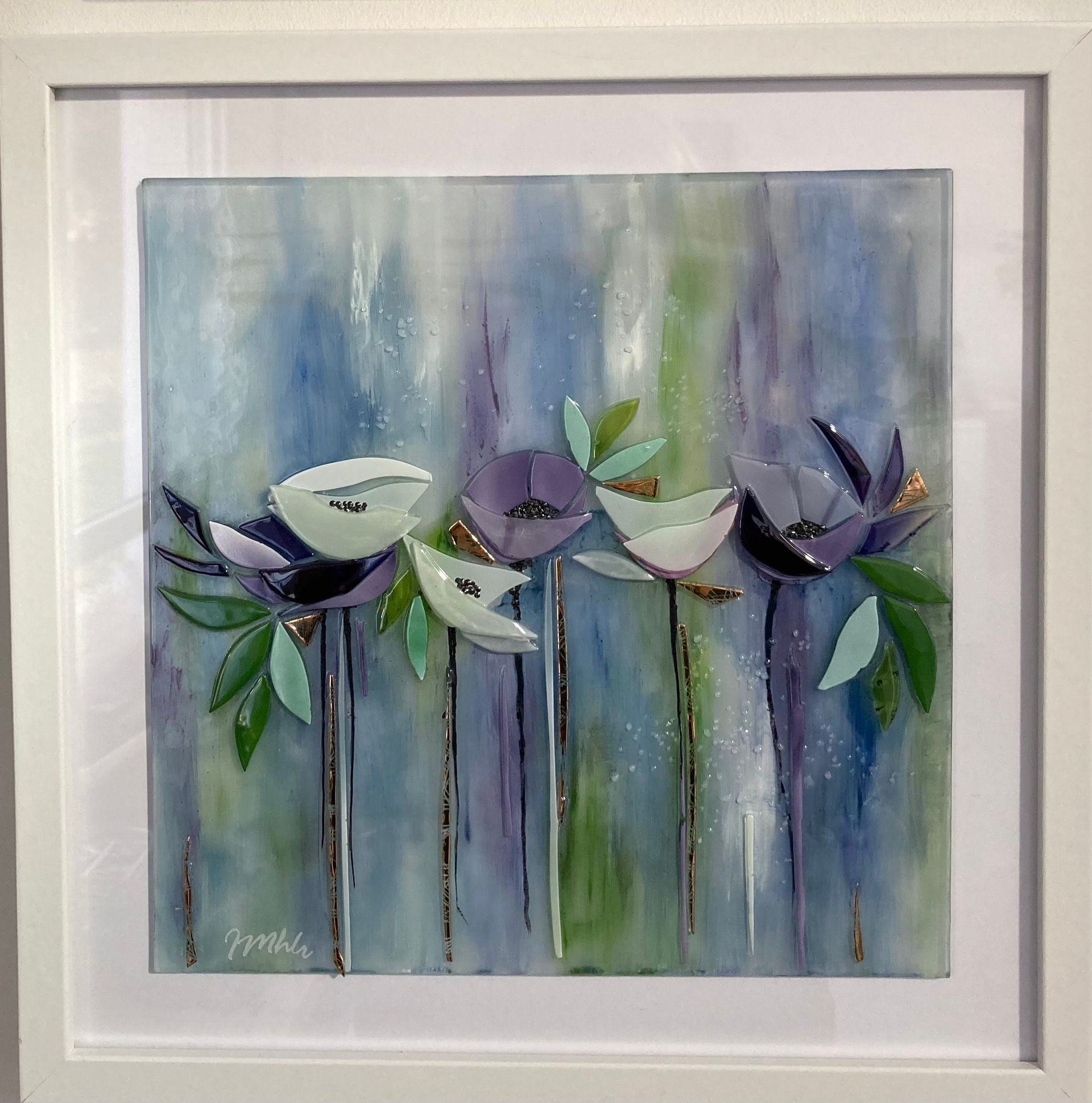 Nos tableaux en verre fusionnés combinent différentes techniques du travail du verre à chaud. Ainsi certains décors sont réalisés au chalumeau, d'autres sont issus de verres pilés, réduits en poudre ou rehaussés d'émail. Plusieurs cuissons sont parfois nécessaires pour obtenir l'aspect final.